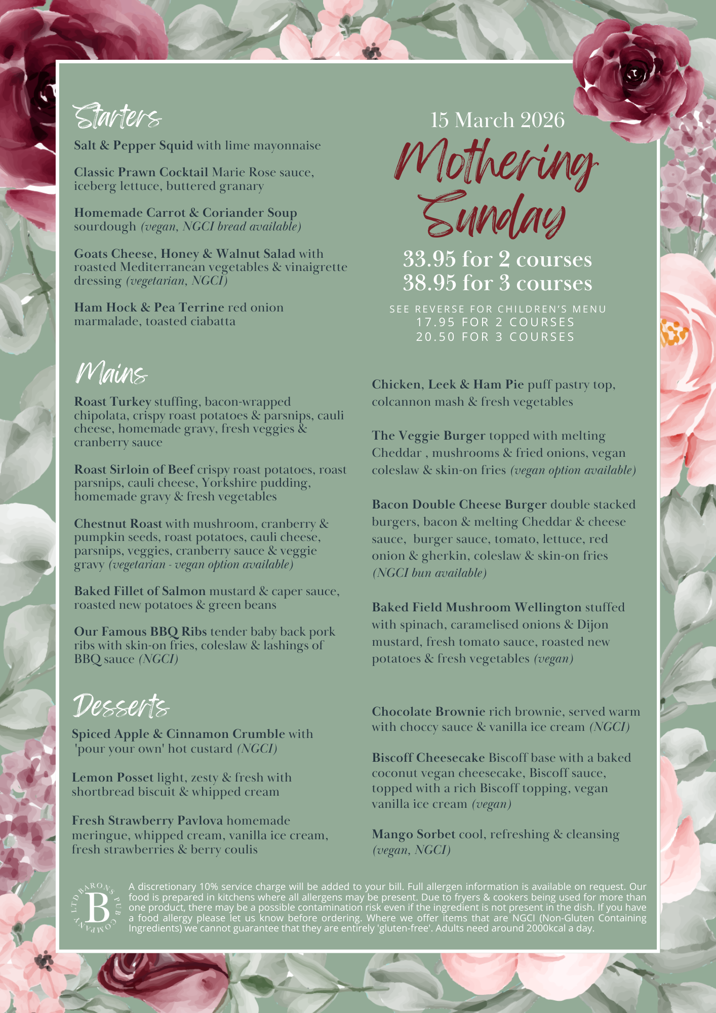 All guests on Sunday 15 March 2026 will be offered the Set Menu only.Â